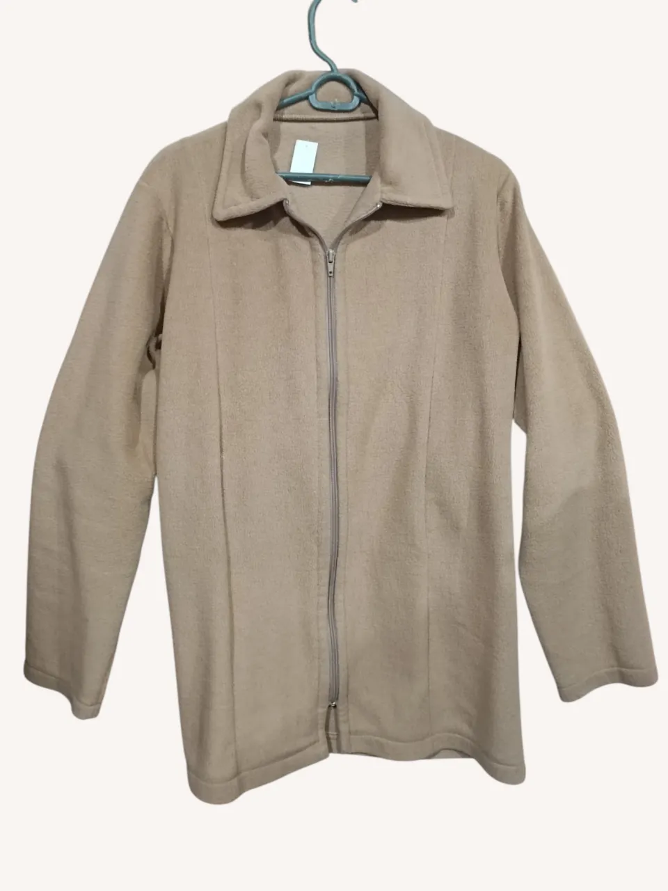 Campera de micropolar color beige con cierre completo al frente y cuello camisero. Posee costuras verticales que marcan la silueta. 📏Medidas: Ancho 50 cm (altura axilas). Largo 76 cm.