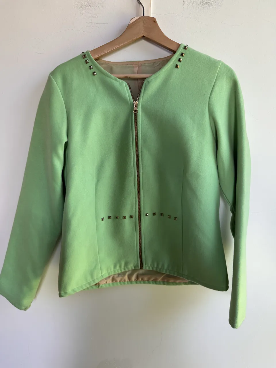 Campera verde claro con tachas plateadas en cuello y bolsillos. Cierre metálico al frente. Interior forrado.