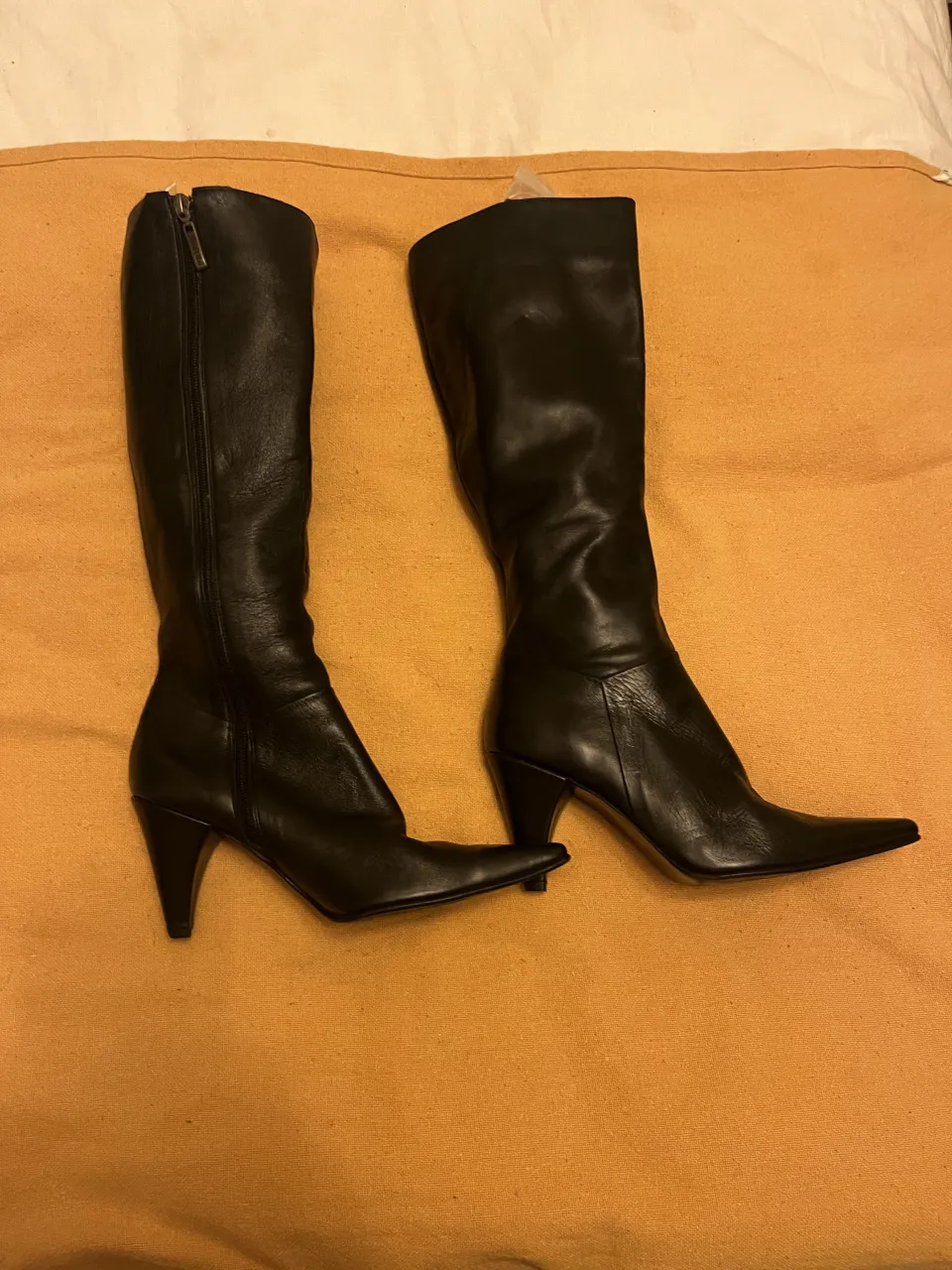 Botas PRUNE de cuero negras, caña alta, con taco fino y punta fina. Cierre lateral para facilitar el calce. Ideales para un look elegante y sofisticado.