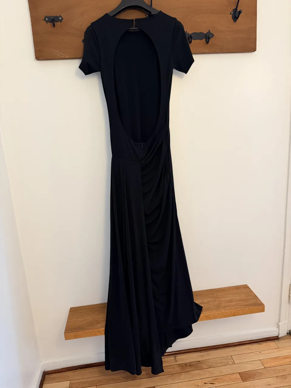 Vestido largo negro con escote en la espalda y detalle de fruncido en la cintura. Posee mangas cortas.