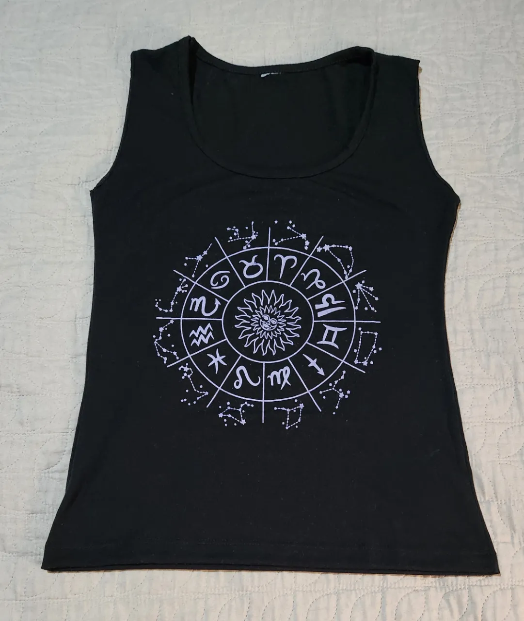 Musculosa negra con estampa circular de signos del zodíaco y el sol en el centro.