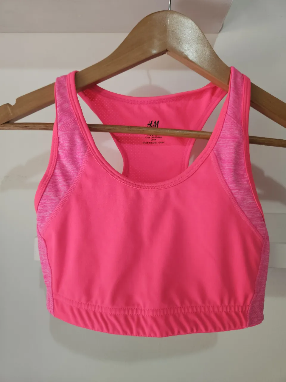 Corpiño deportivo H&M de color rosa, con breteles tipo racerback y detalles de tela con textura en los laterales. El corpiño equivale a un taller 85 en Argenitna