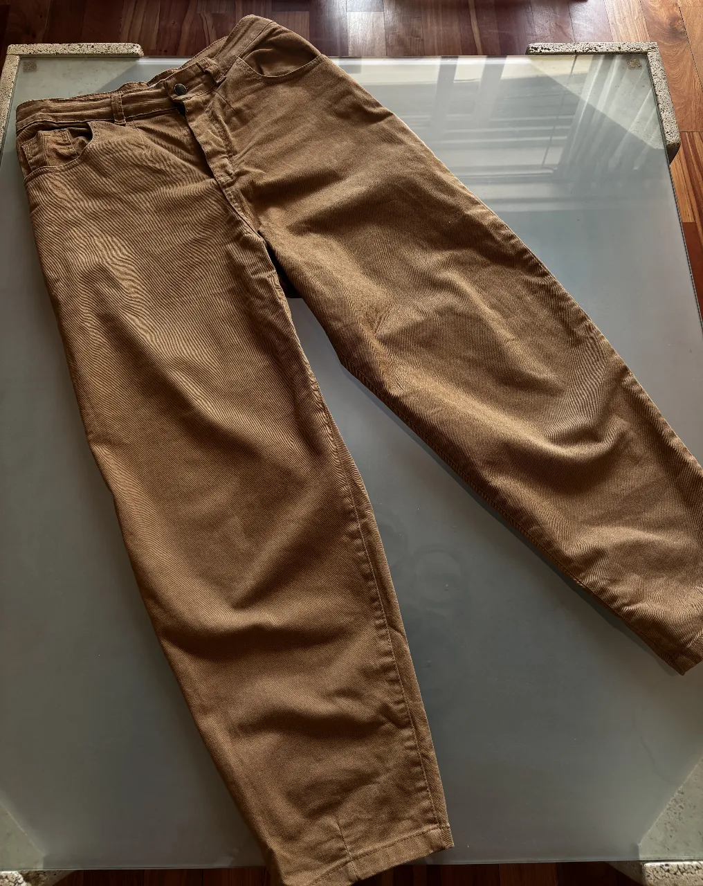 Pantalón de pana marrón, tiro alto, corte recto y pierna ancha. Ideal para un look casual y cómodo, perfecto para el día a día.