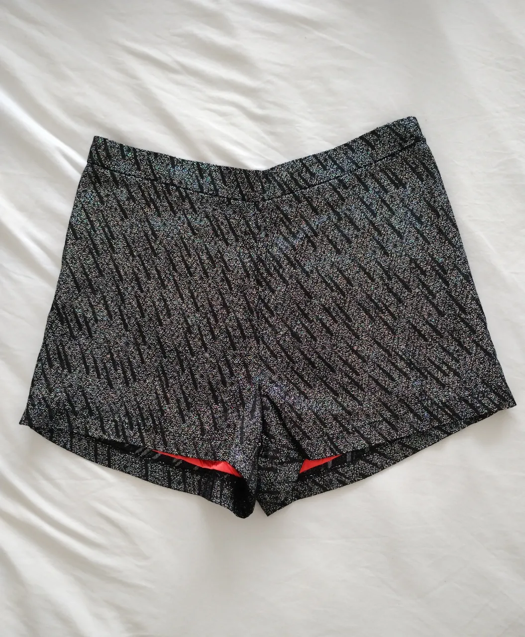 Shorts de fiesta con brillos plateados y detalles en negro. Forro interno. tiene un defecto en la parte de atrás (puesto no se nota mucho). cintura 36 cm. cadera 47 CM. tiro 27 cm. largo 30 cm