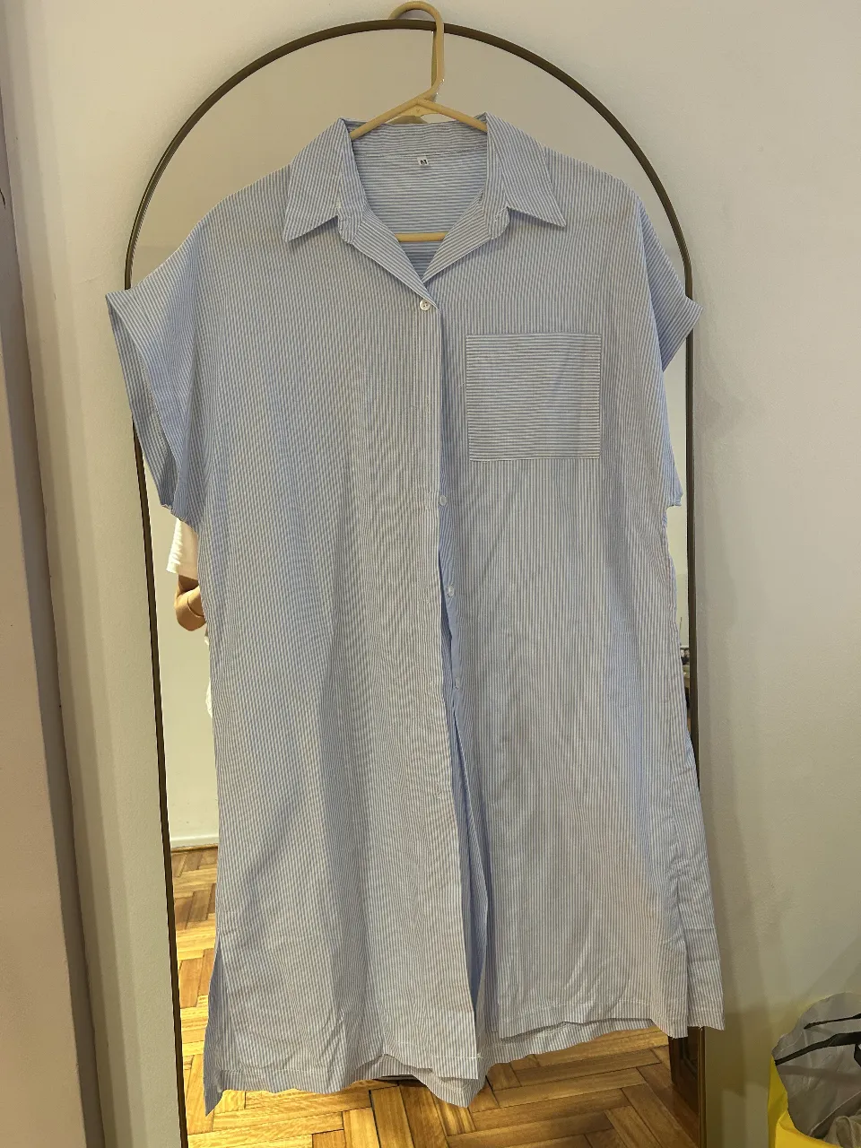 vestido camisero largo a rayas celestes y blancas, con cuello y manga corta. Posee un bolsillo en el frente y tajos laterales. Ideal para un look casual y fresco. de algodón sin uso