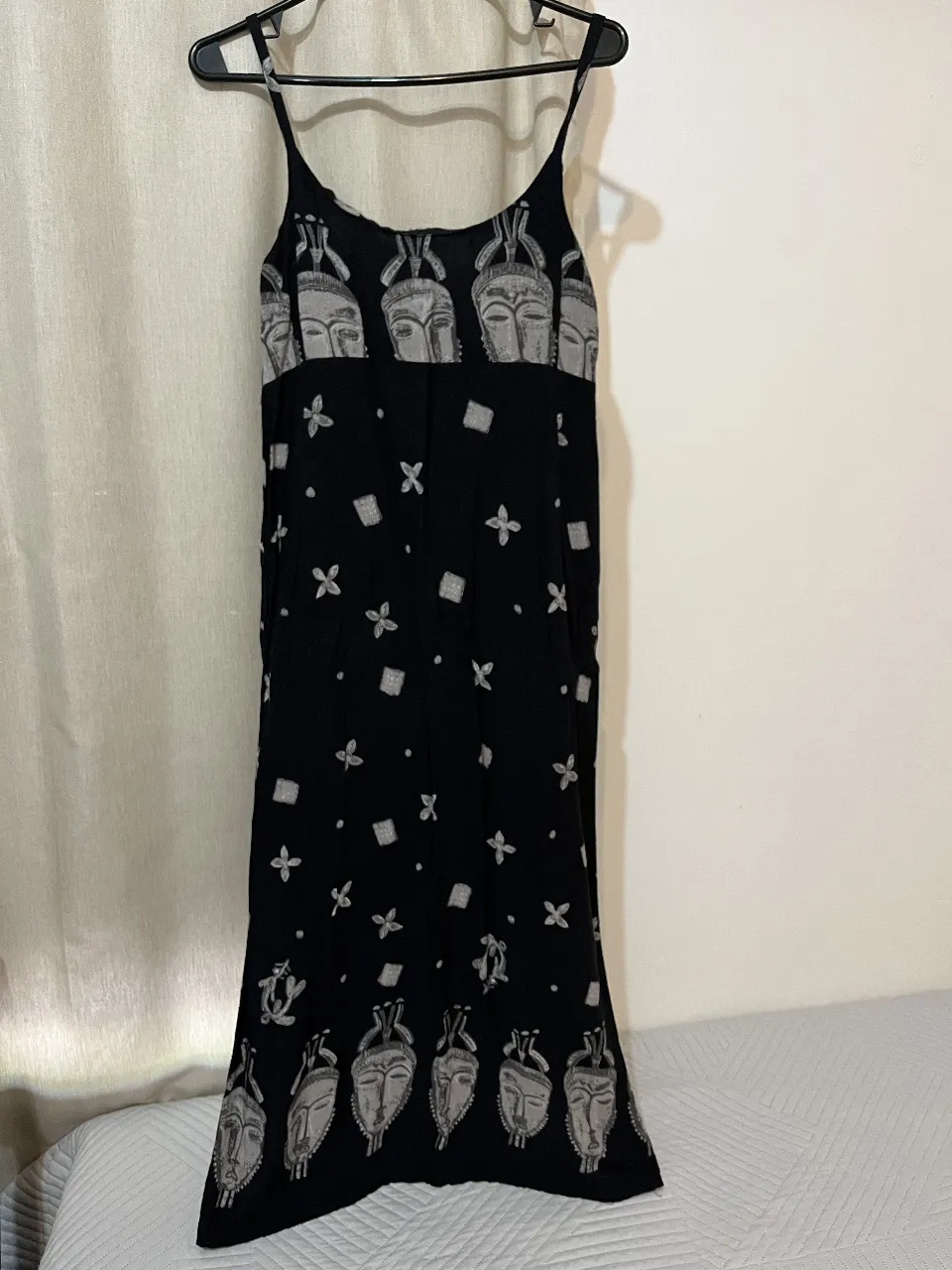 Vestido largo negro con estampa de máscaras tribales y pequeños motivos florales y cuadrados. Es bien al cuerpo, talle s, largo ideal si medís 1,70, tiene cierre detrás.