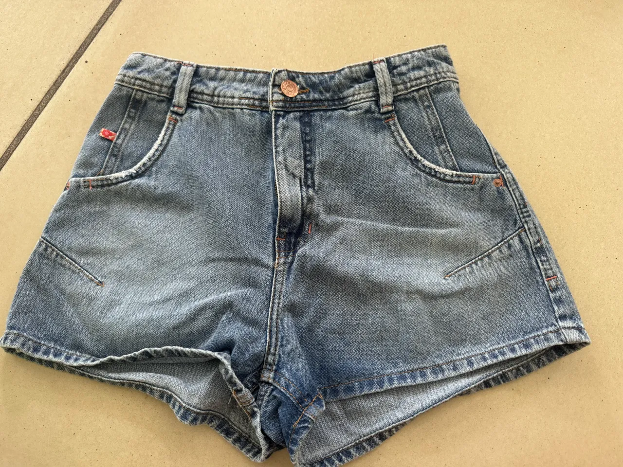Shorts de jean tiro alto, color azul desgastado. Posee bolsillos delanteros y traseros.