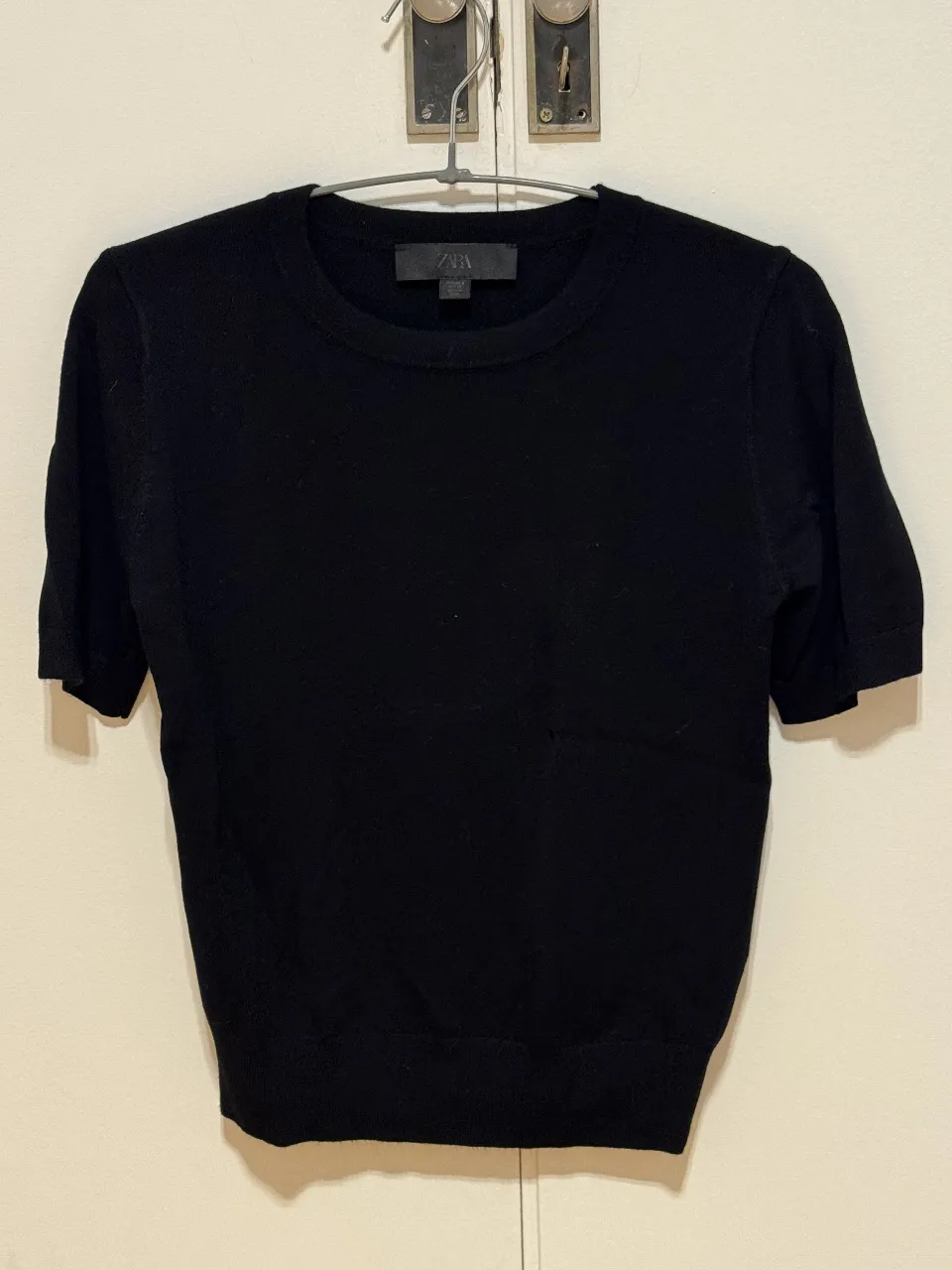 Remera de tejido suave negra de manga corta, escote redondo. Ideal para un look casual o para combinar con otras prendas.