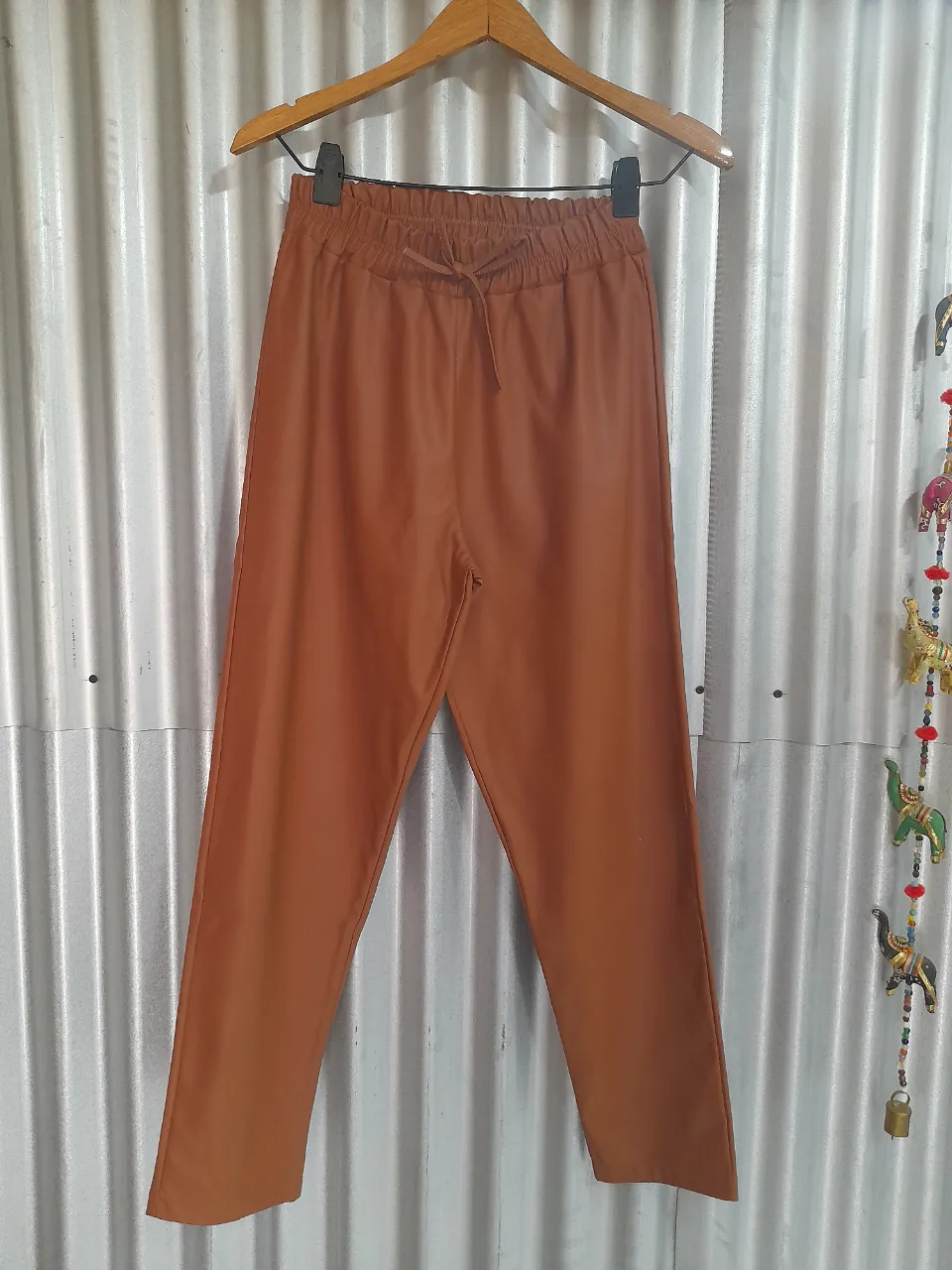 Pantalón de cuero sintético color marrón. Posee cintura elastizada con cordón ajustable y bolsillos laterales.