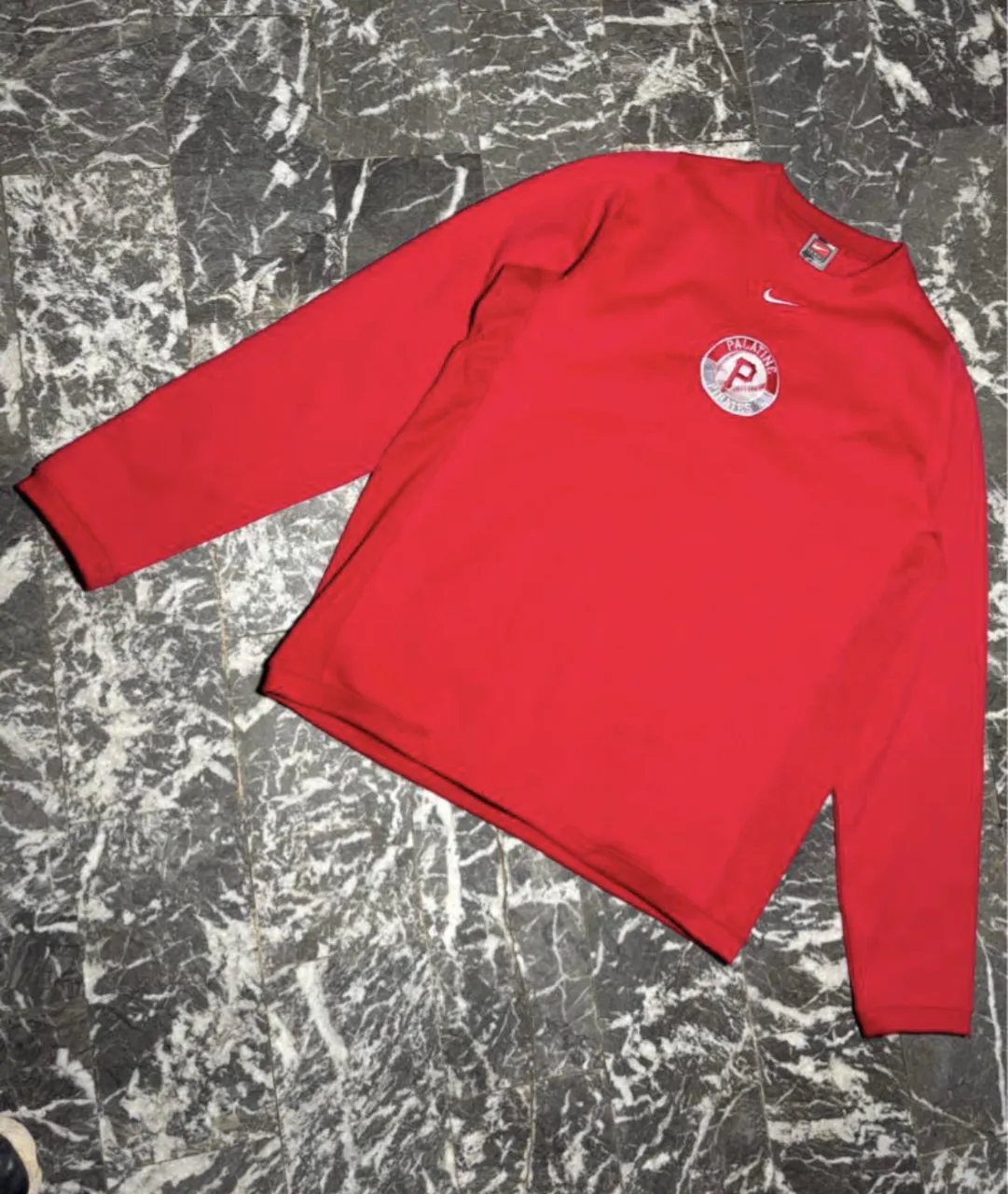 Remera roja de manga larga, ideal para entrenamientos o uso casual. Presenta un logo bordado en el pecho con las iniciales 'P' y detalles de béisbol, además del icónico swoosh de Nike. Perfecta para los fanáticos del deporte y el estilo urbano.