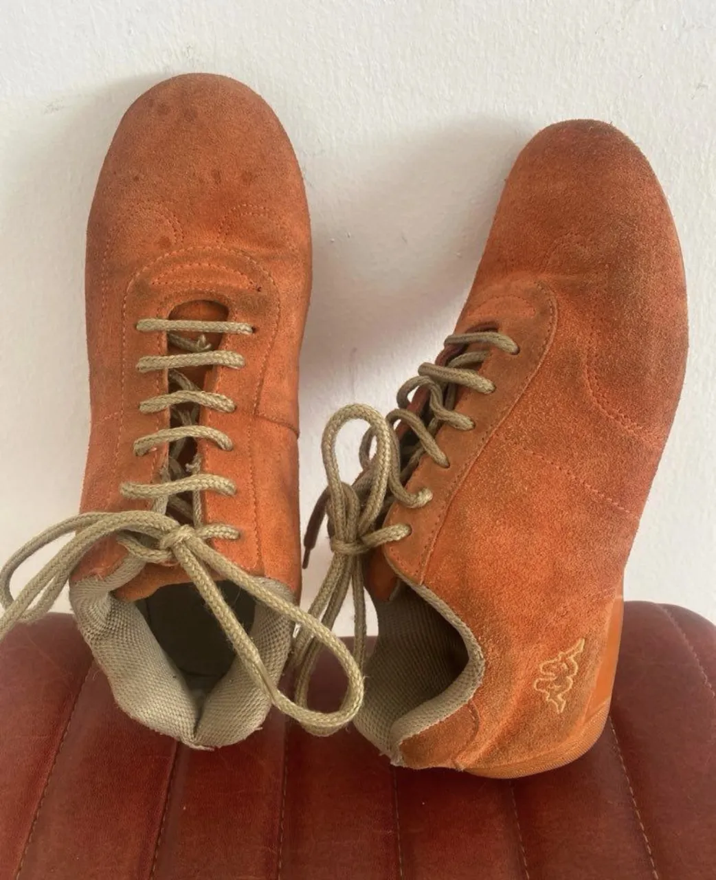 zapatillas kappa naranjas de gamuza, con cordones beige. ideales para un look casual y súper cómodas para tus actividades diarias o deportivas. ¡un toque vibrante para tus pies! un clásico vintage para mandar a limpiar y que queden como nuevas