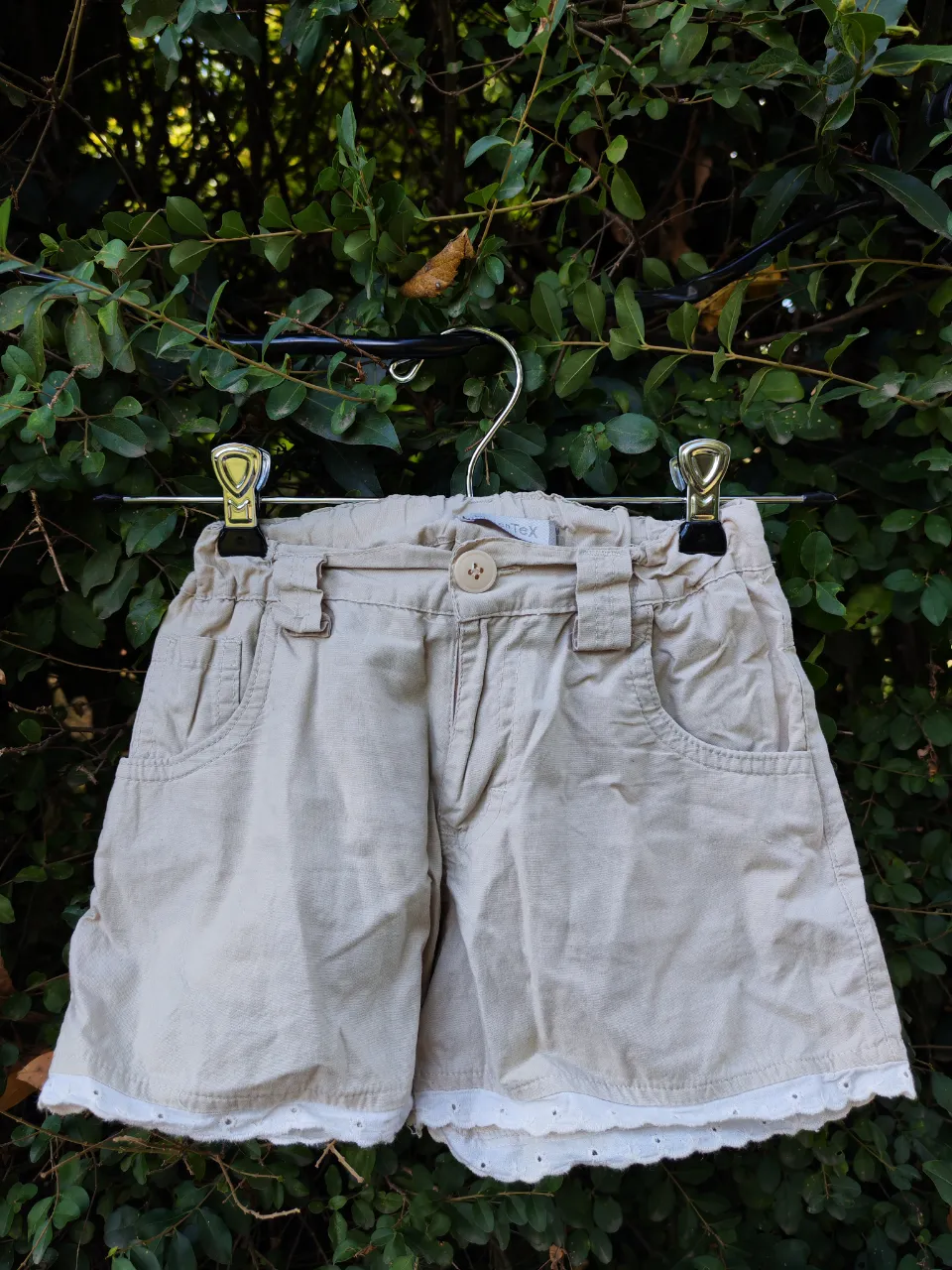 Shorts de gabardina color crudo con detalles de puntilla en los bordes. Tienen bolsillos delanteros y traseros, y un botón en la cintura. Ideales para un look casual y fresco.