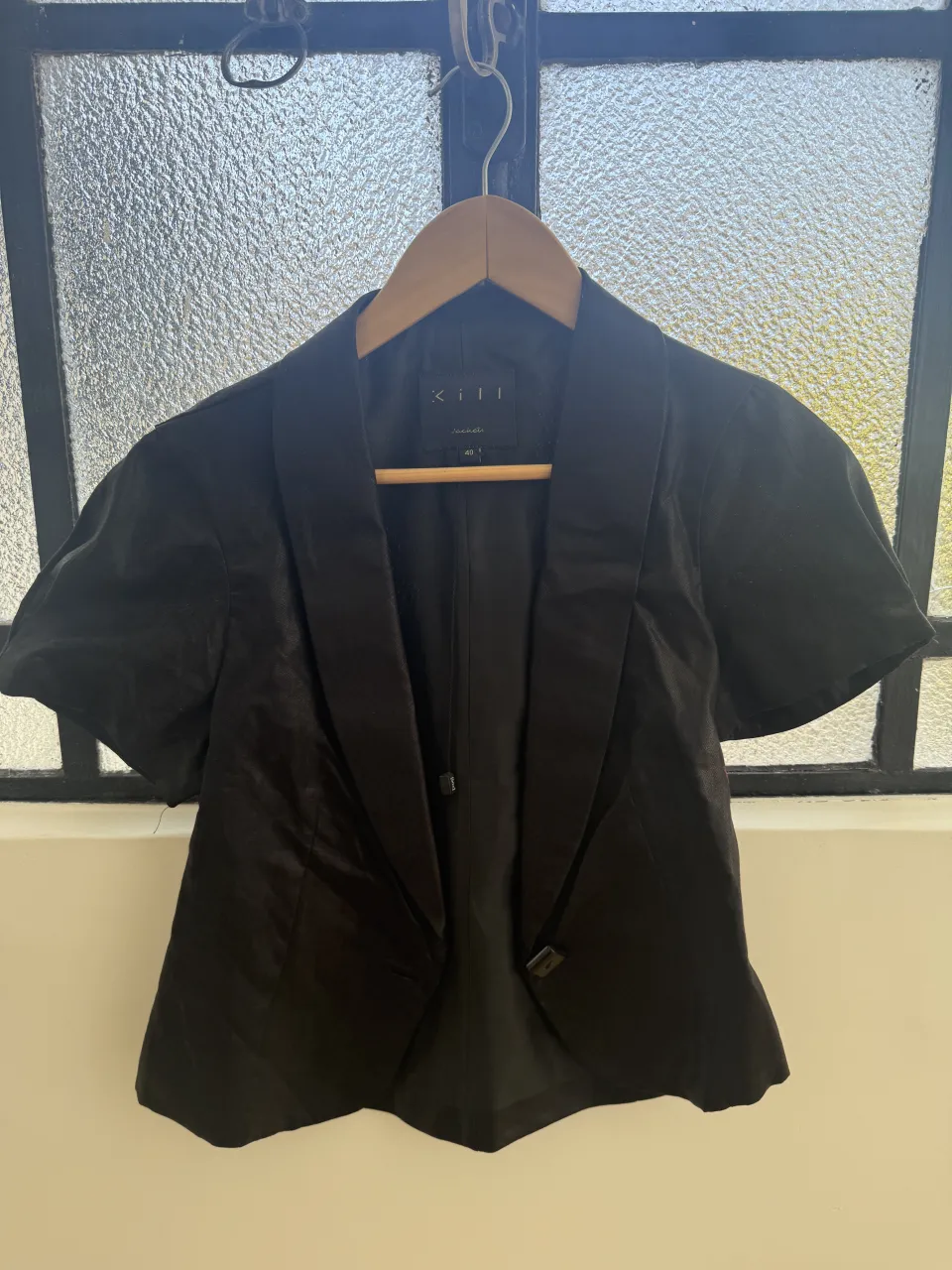 Blazer negro de vestir con mangas cortas y solapa. Ideal para un look elegante y sofisticado.