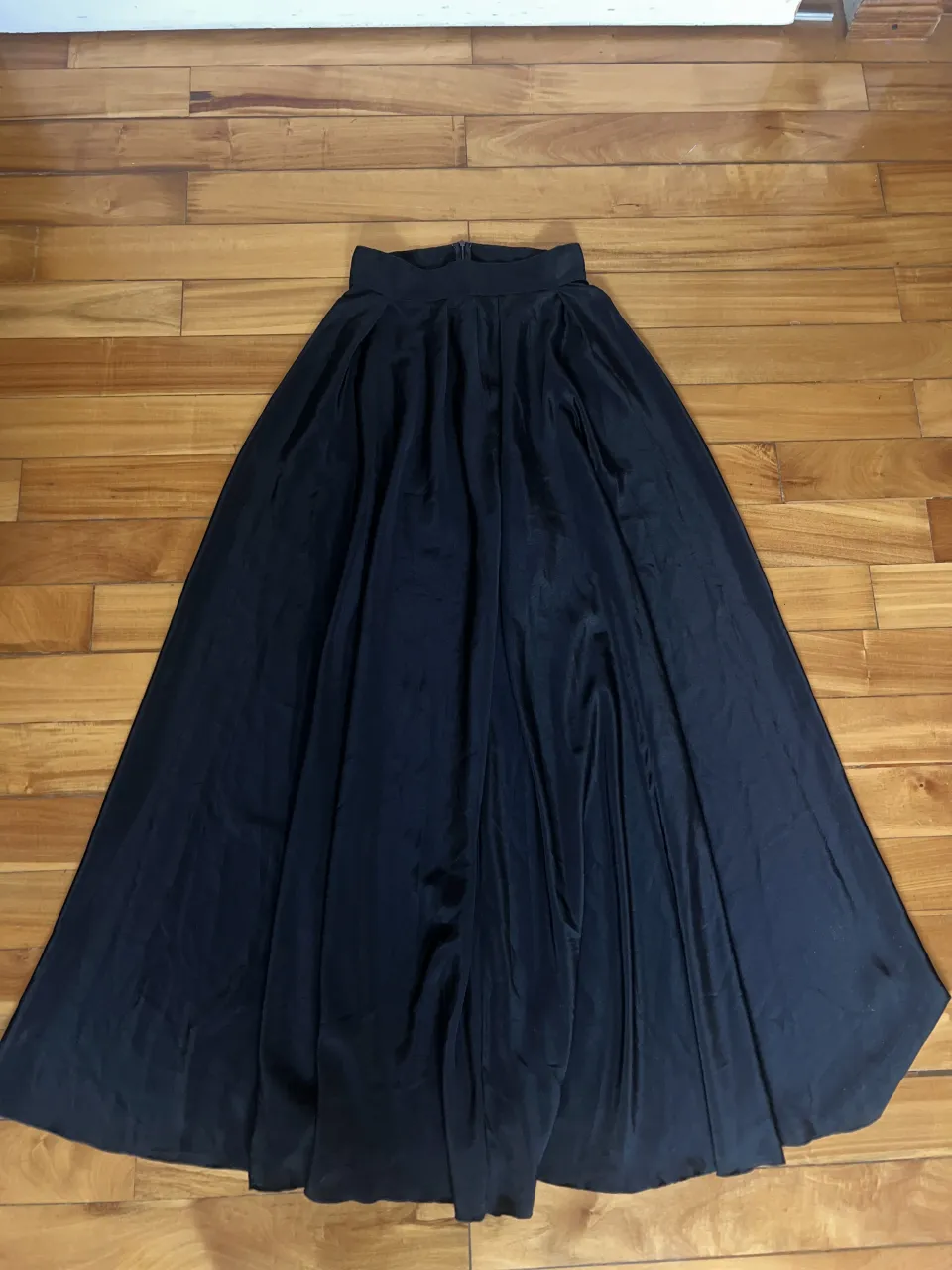 Pollera larga negra con cintura alta y frunces en la parte superior. Cierre en la espalda. Tiro alto
