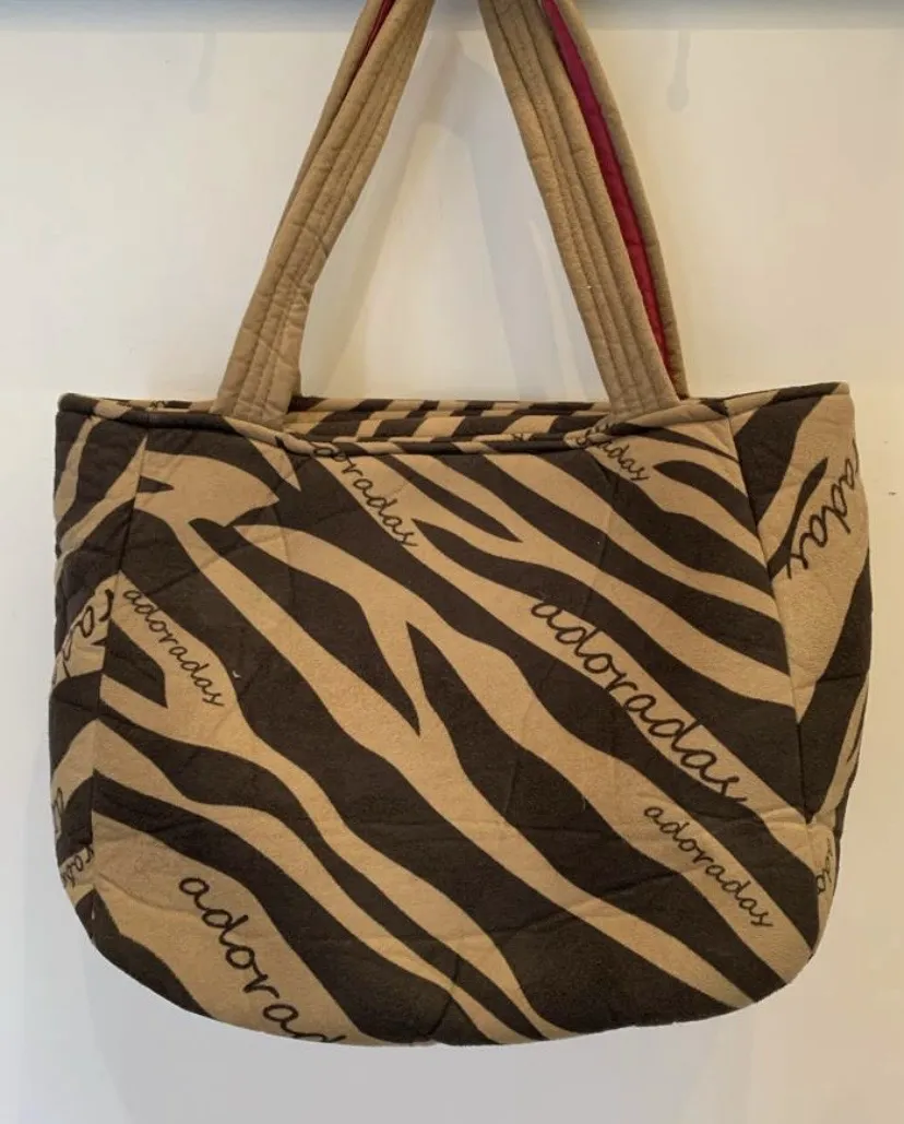 Bolso de tela con estampa de cebra en marrón y beige. Tiene dos manijas y el logo 'adoradas' repetido en toda la estampa. Es un bolso enorme ideal para ir a trabajar o la facultad te entra la computadora perfectamente