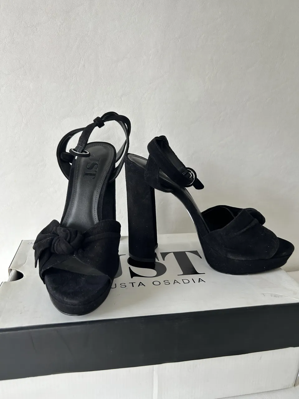 Sandalias negras con taco alto y plataforma. Tienen una tira fina que rodea el tobillo con hebilla y una tira ancha en la parte delantera con un nudo.