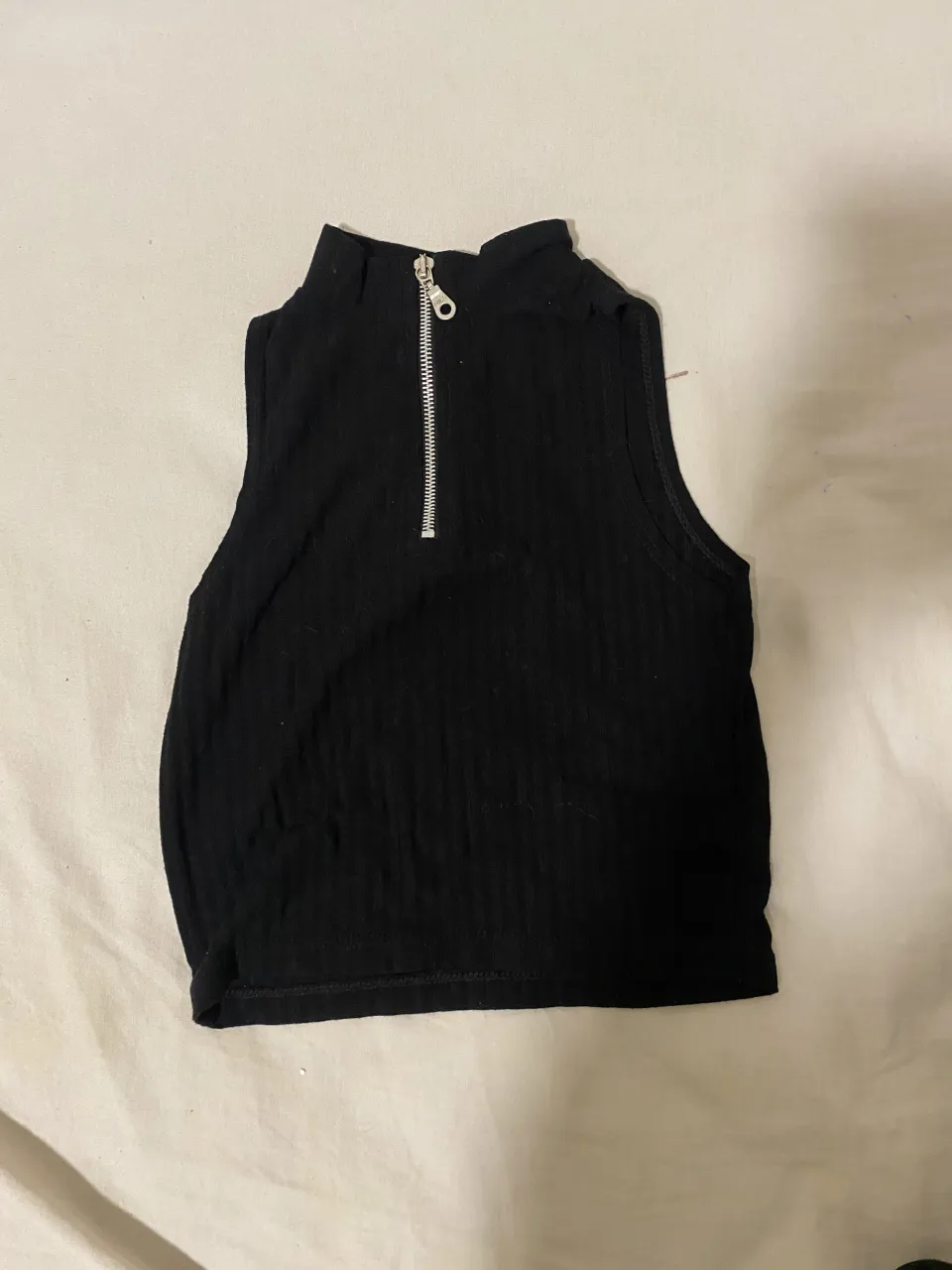 Musculosa negra con cuello alto y cierre metálico plateado al frente.