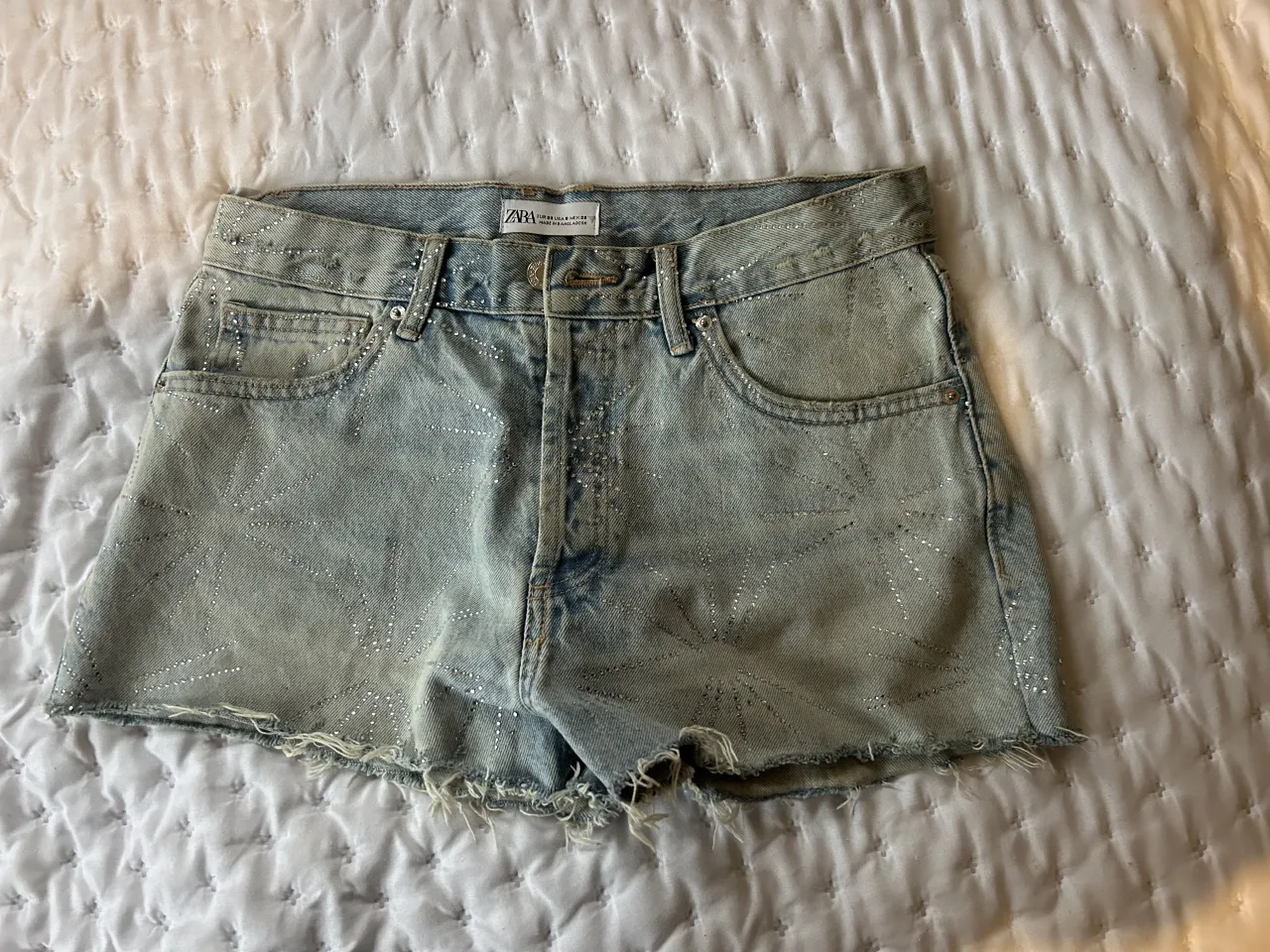 Shorts de jean tiro medio/bajo con roturas y detalles de brillos plateados en forma de estrellas y líneas. Cintura con botón y cierre.