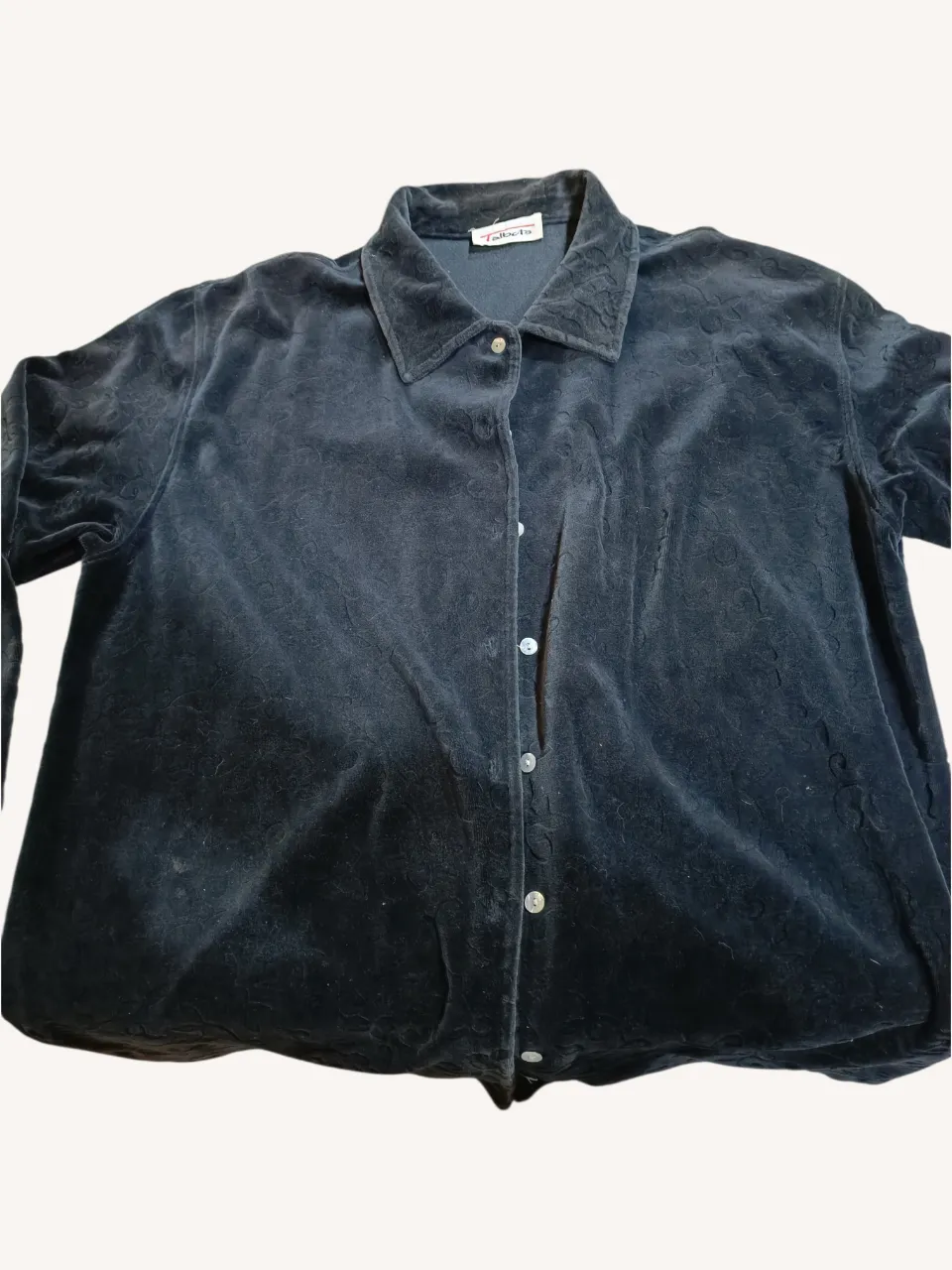 Camisa de terciopelo negra con botones de nácar. Posee un estampado floral sutil en relieve. 📏Medidas: Ancho 55 cm. Hombros 52 cm. Largo 75 cm. Sisa 26 cm. ‼️ Desgaste en los codos (foto).