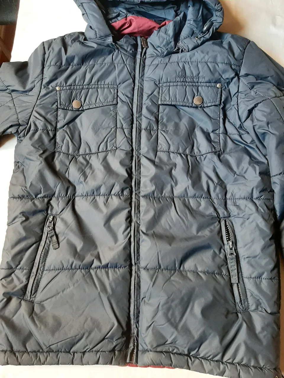 Campera azul marino con capucha, cierre central y bolsillos frontales con cierre. Interior forrado en color bordo.