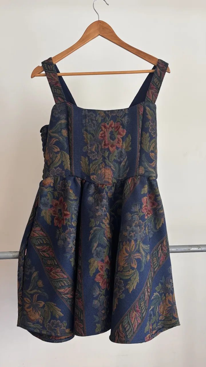 Vestido corto con estampado floral estilo vintage. Posee breteles anchos y escote cuadrado. La parte trasera tiene un diseño de corsé con cordones y la cintura es fruncida, lo que le da un toque ajustado y favorecedor. Ideal para un look romántico y canchero.