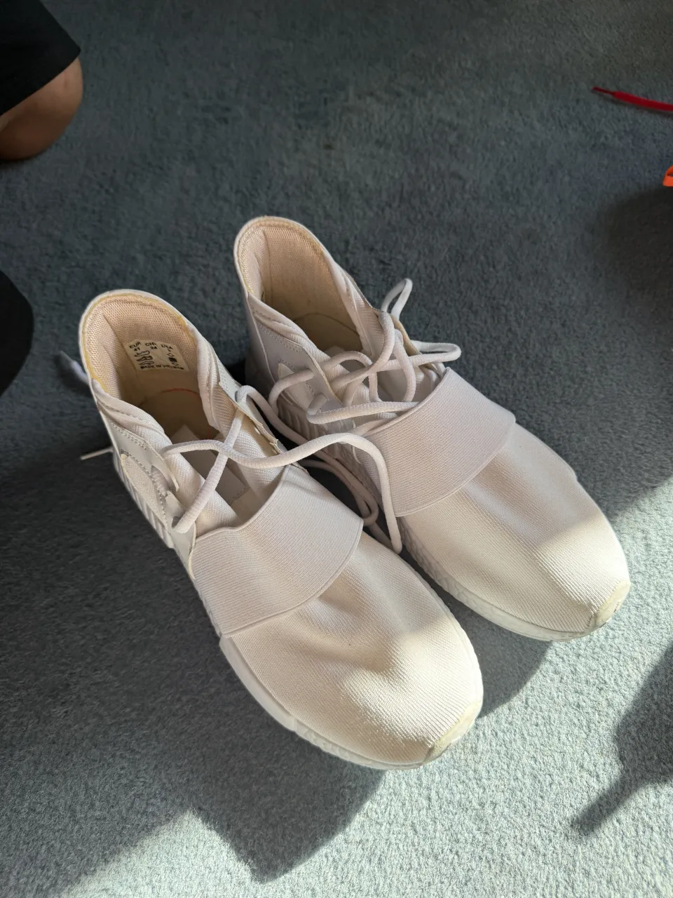 Zapatillas deportivas blancas con cordones y una banda elástica cruzada en el empeine. Suela blanca con textura.