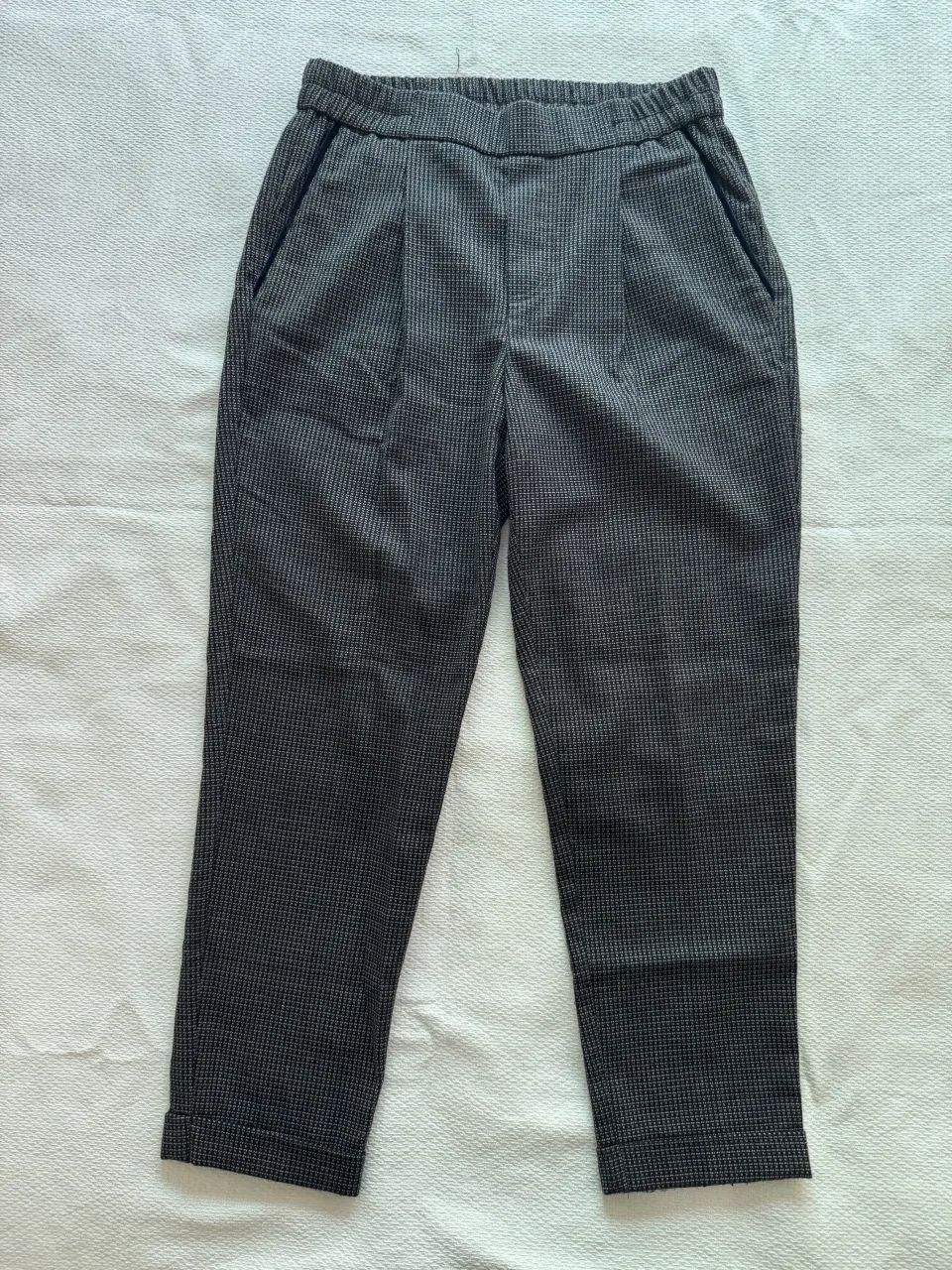 Pantalón de vestir gris con estampado discreto. Posee bolsillos laterales y traseros, y cintura elastizada para mayor comodidad. Ideal para un look casual o de trabajo.
