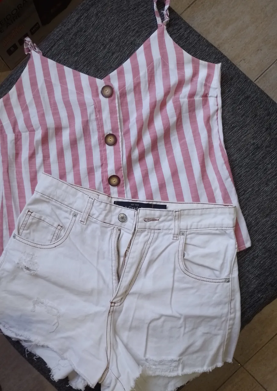 Conjunto de top a rayas rosas y blancas con botones y shorts de jean blancos con roturas. Ideal para un look casual de verano. remera de liño con botones de madera