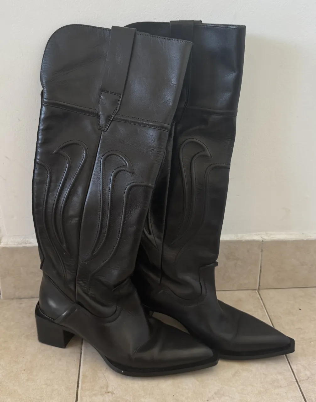 Botas de cuero negras, caña alta, con taco y punta fina. Detalle de costuras en la caña.