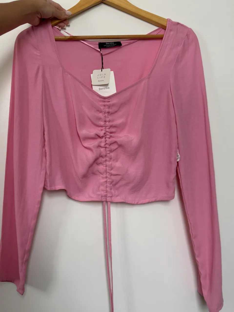 blusa manga larga rosa con escote cuadrado y fruncido delantero con cordón ajustable. nuevo con Etiqueta Bershka.