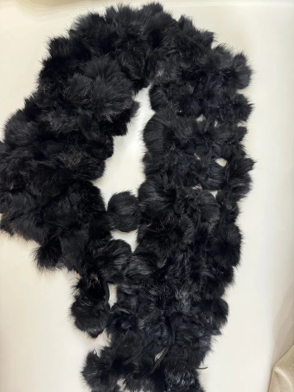 Bufanda de pelo sintético negra, súper suave y calentita. Ideal para darle un toque glamoroso a cualquier outfit de invierno. Perfecta para fiestas o salidas nocturnas.