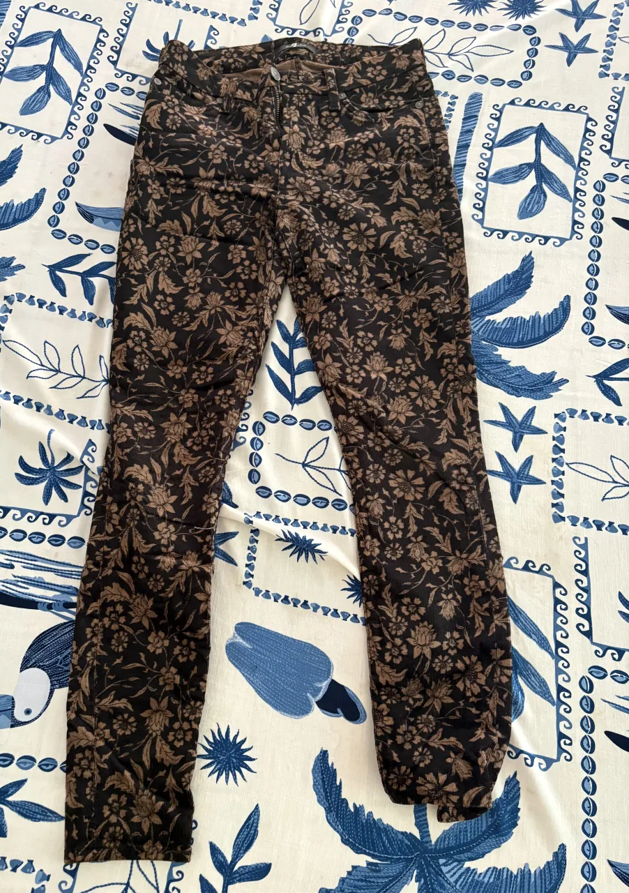 Pantalón de pana con estampado floral en tonos marrones y negros. Un clásico que nunca pasa de moda, ideal para darle un toque chic a tu look.