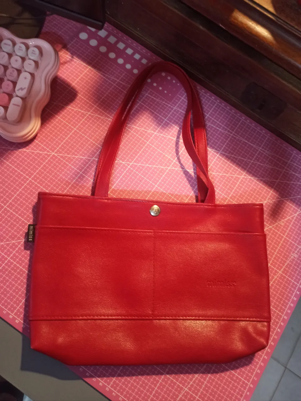 Cartera roja de cuero, con dos bolsillos frontales y cierre de botón a presión. Ideal para el día a día o para darle un toque de color a tu outfit.