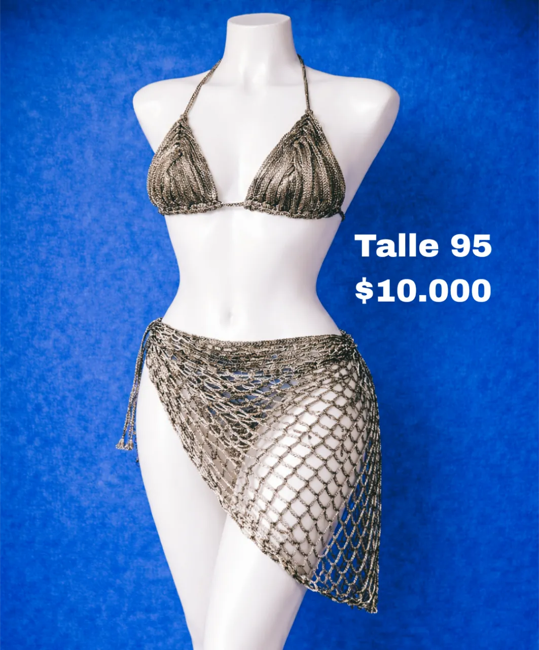 Conjunto de bikini tejido plateado con pollera de red. Ideal para lucir espectacular en la playa o en una fiesta de verano.