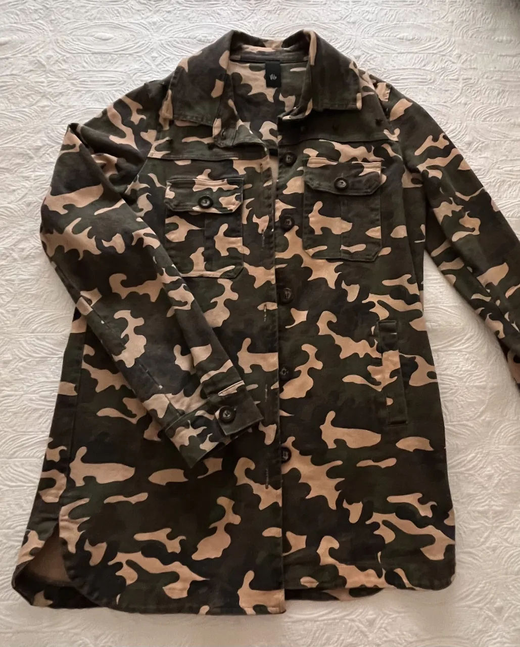 Campera de jean estilo militar con estampa camuflada. Tiene bolsillos en el frente y botones. Ideal para un look canchero y urbano.