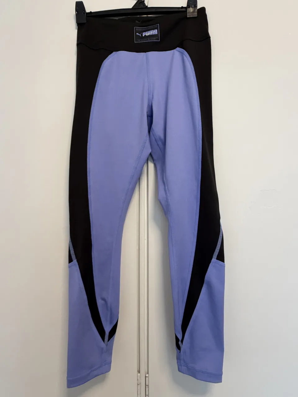 Calzas deportivas Puma de color negro y lila. Tienen un diseño con paneles de color que se cruzan en los laterales.