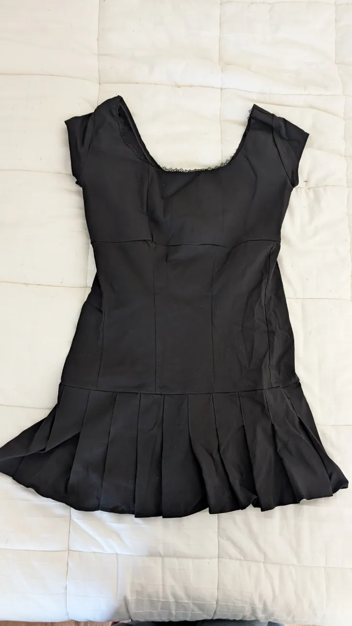 Vestido negro mini con falda plisada. Ideal para una salida o fiesta.