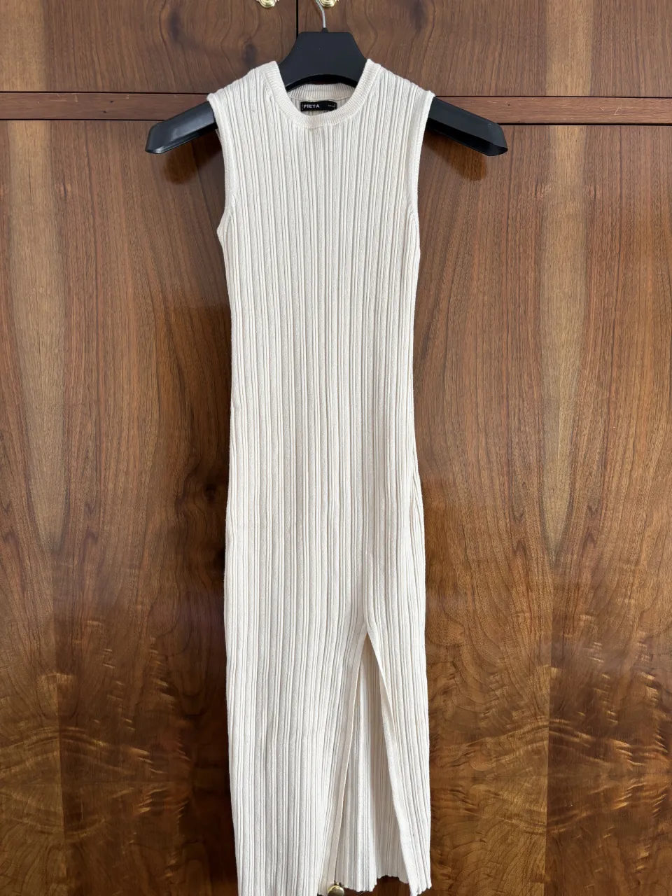 Vestido tejido sin mangas, color crudo, con cuello redondo y tajos laterales. La prenda es de tejido acanalado.