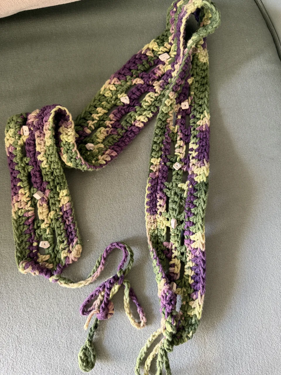 Faja tejida a mano en crochet, con un diseño vibrante en tonos verdes y violetas. Posee detalles calados y pequeñas piedras blancas que le dan un toque único. Perfecta para añadir un toque de color y estilo a tus outfits. Queda divina con jeans o en vestidos. La faja tiene 84 cm de largo y 6 cm de ancho sin incluir las tiras finitas para atarla.