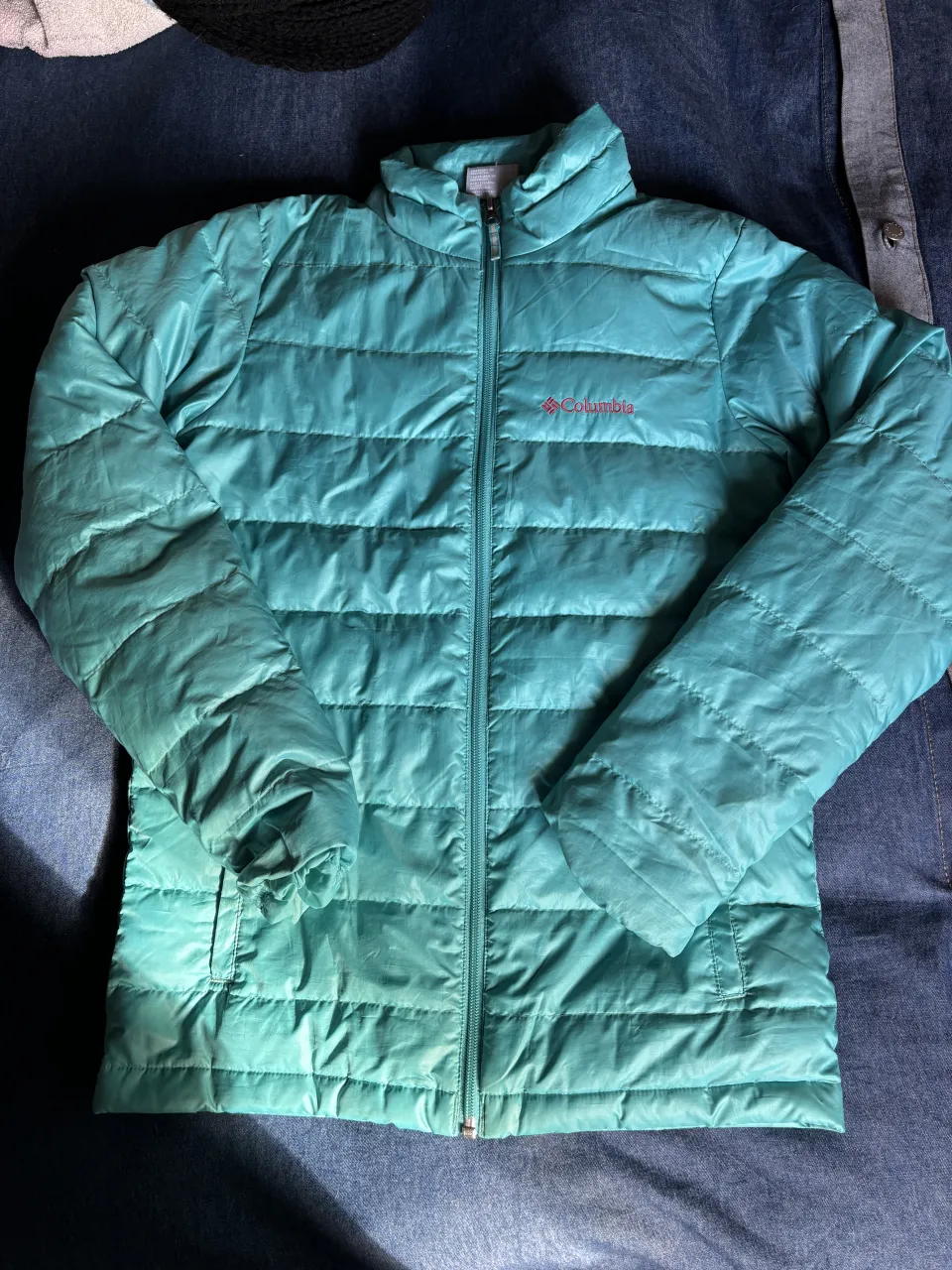 Campera acolchada Columbia, ideal para el frío. Color turquesa vibrante, perfecta para un look casual y deportivo. Con cierre al frente y bolsillos laterales. Tiene una pequeña imperfección en una de las mangas (última foto)