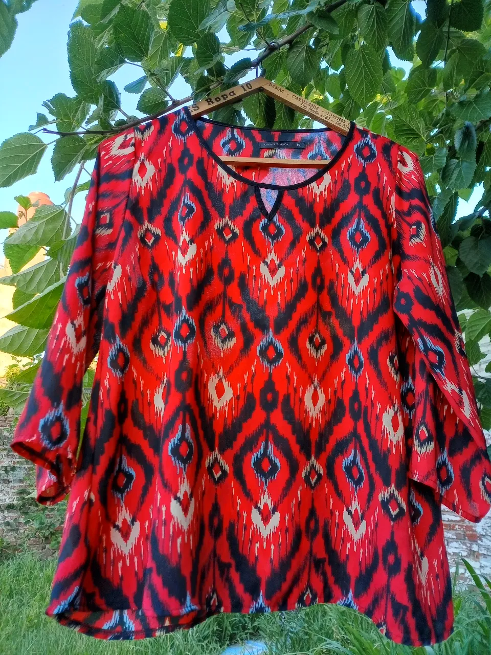 Blusa estampada con un diseño vibrante en tonos rojos, negros y detalles en blanco y azul. Posee un escote en V con un borde negro que le da un toque elegante. Ideal para un look casual o para una salida.