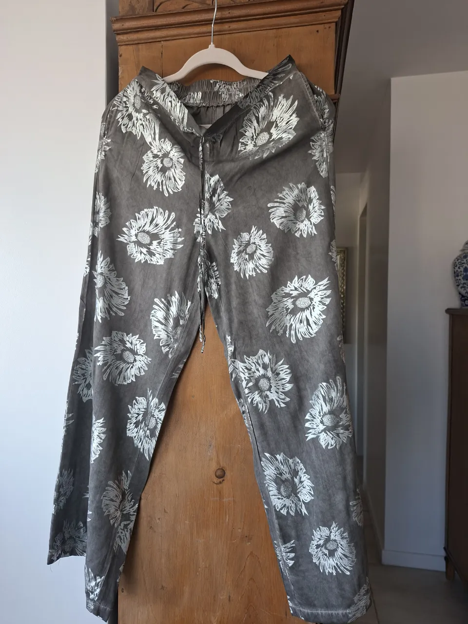 Pantalón largo estampado con flores blancas sobre fondo gris. Posee cintura elastizada y cordón.
