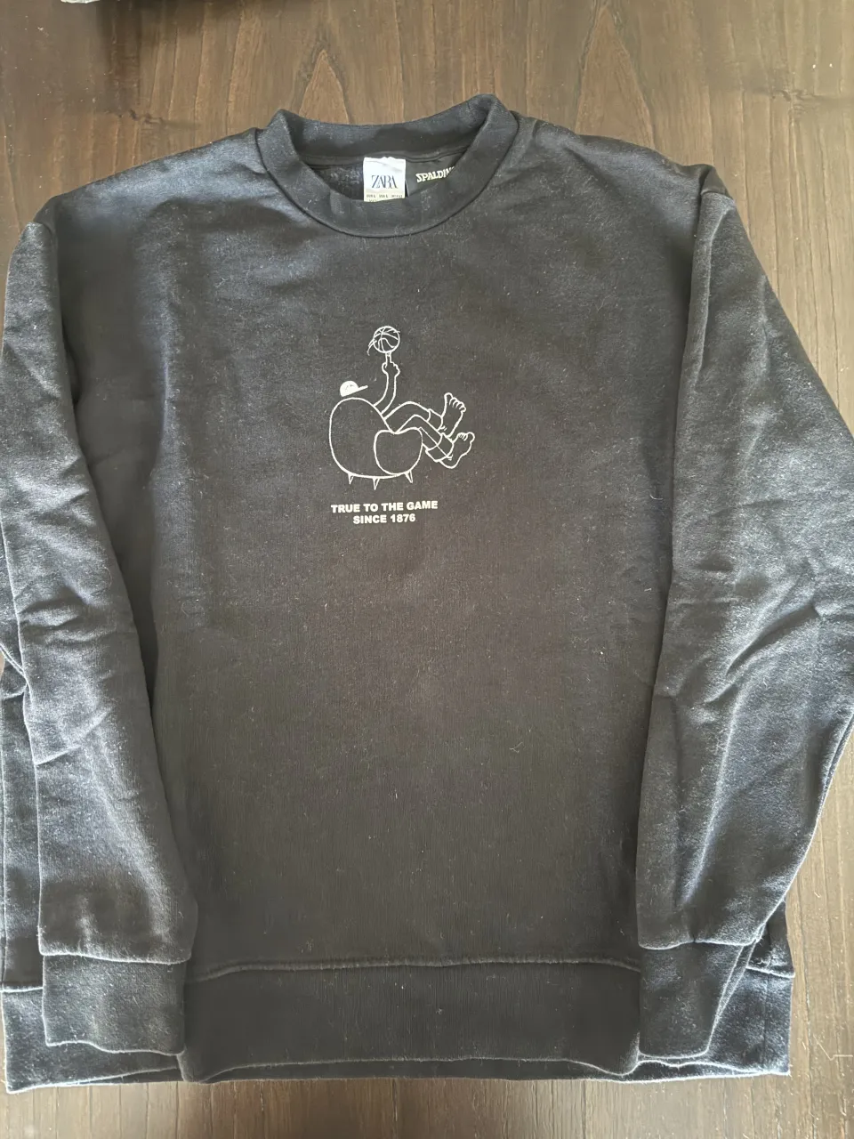 Buzo negro de Zara "TRUE TO THE GAME SINCE 1970". En la espalda tiene el logo "SPALDING" en blanco. Con friza.