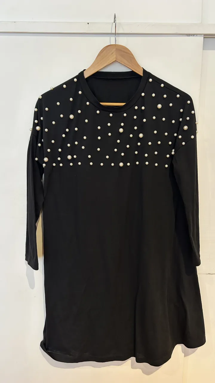 vestido corto negro de manga larga con detalles de perlas en el cuello y hombros. Un toque elegante y moderno para cualquier ocasión. ( talle xl chico )