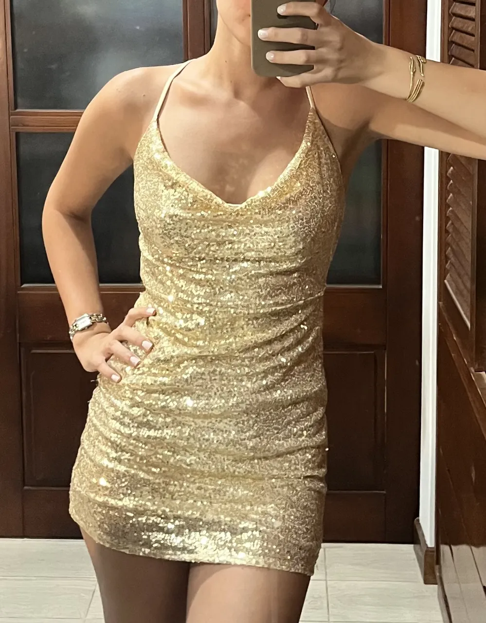 Vestido dorado con lentejuelas, done forro. Ideal para fiestas o eventos especiales. Su diseño con tiras finas y escote niche. Se ata en la espalda que es abierta con cruces