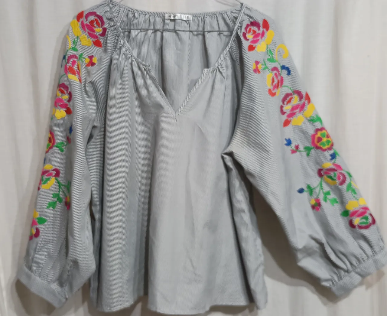 Blusa de mangas largas a rayas grises y blancas, con un escote en V y bordados florales coloridos en los hombros y mangas. Un diseño único, talle XXL, sisa 58 cm , largo 59 cm, tela camisera