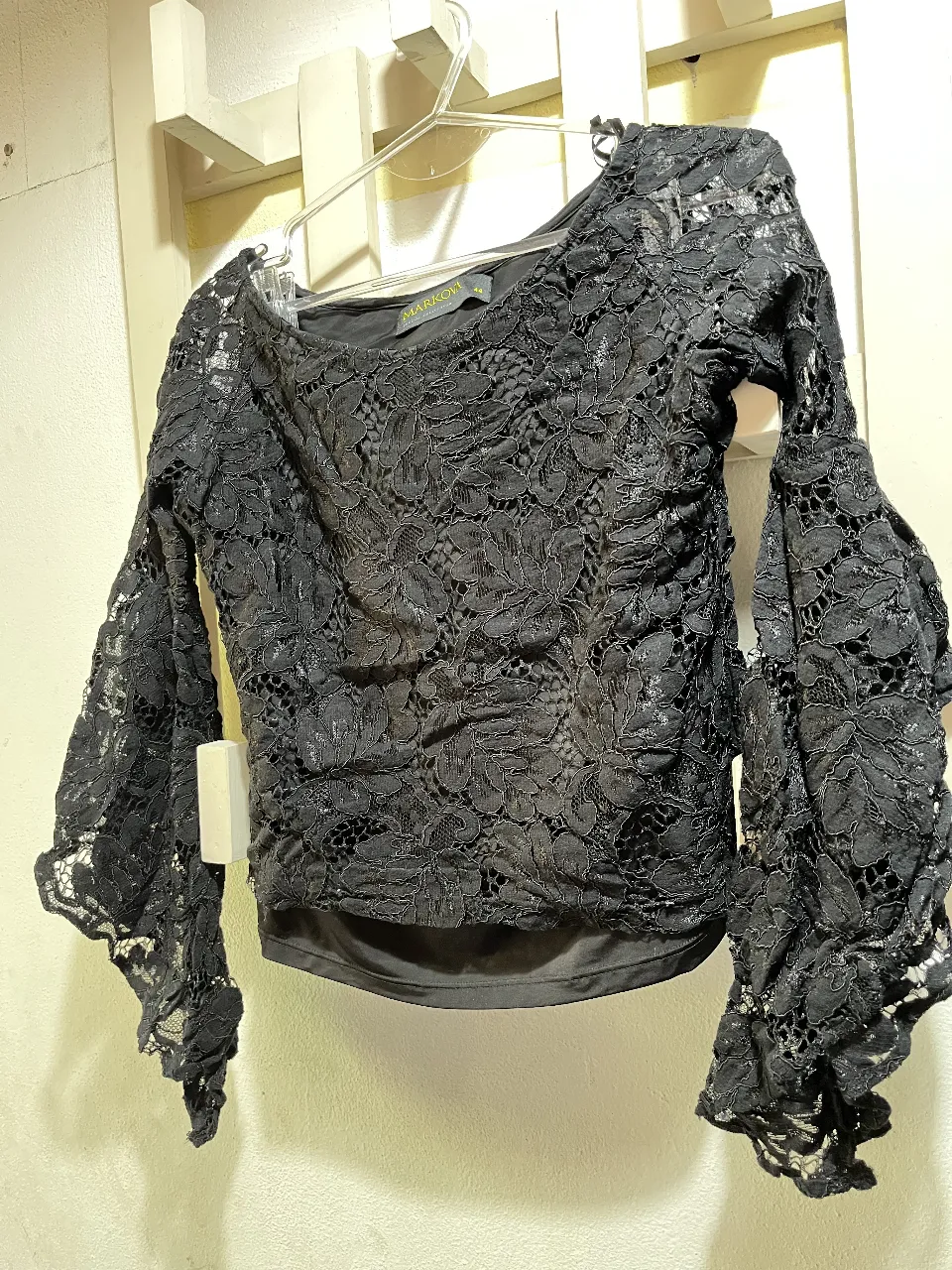 Blusa de encaje negra con mangas largas acampanadas y detalles volados. Perfecta para un look elegante y sofisticado. Marca Markova medidas: 46 cm de axilas 42 cm de hombros aprox 43 cm frente de encaje 13 cm de ancho aprox de mangas antes de acampanarse