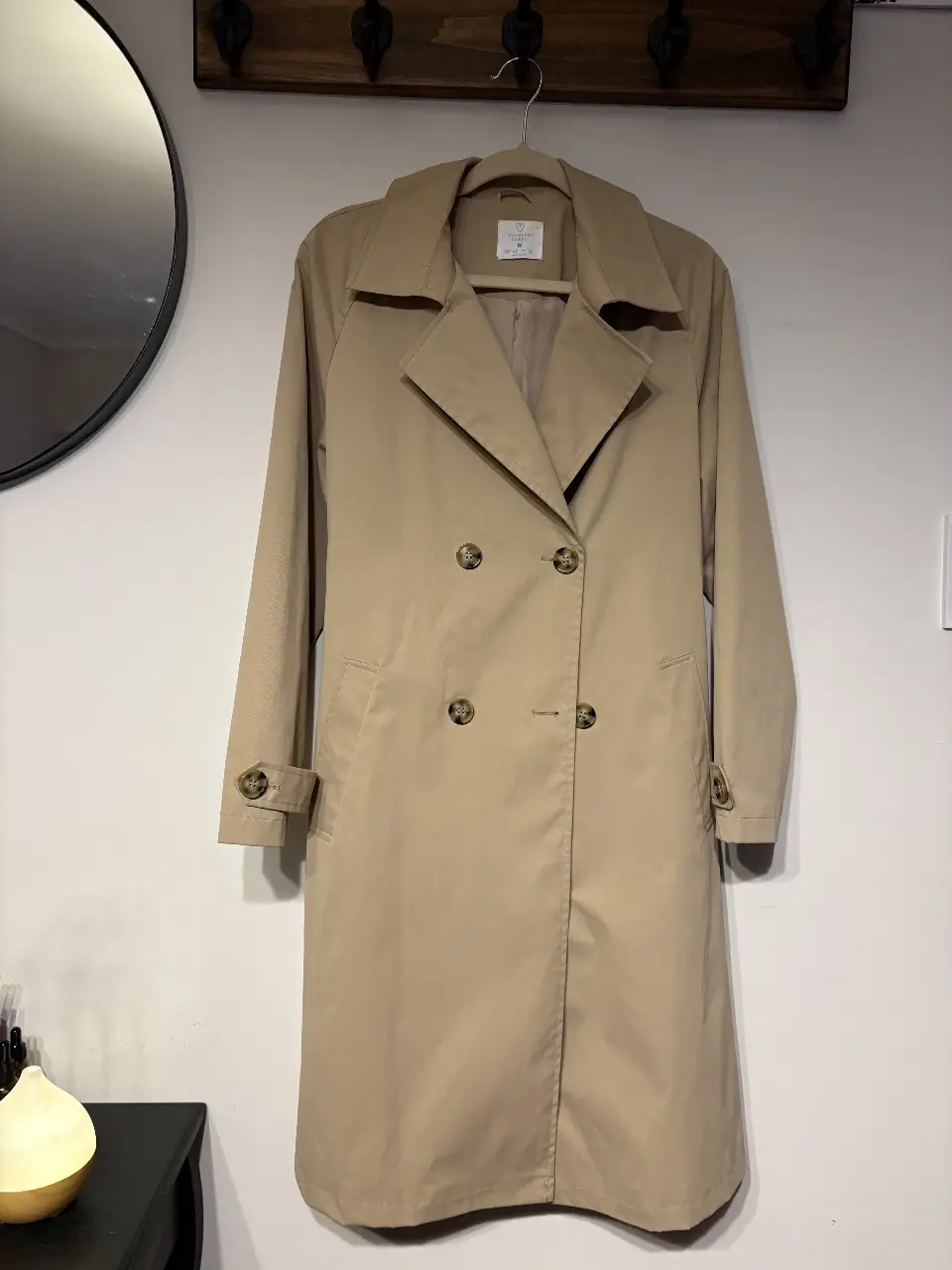 Trench coat color beige, con doble botonadura y cinturón. Ideal para un look elegante y sofisticado.