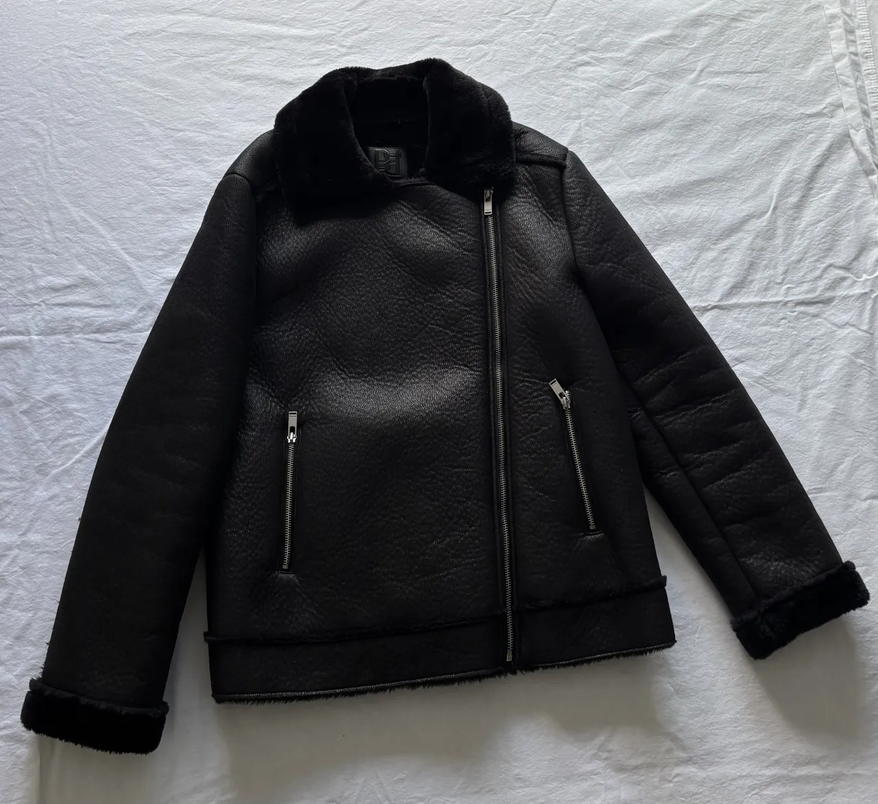 Campera negra de cuero sintético con cuello y puños de pelo sintético. Cierre central y bolsillos frontales con cierre.