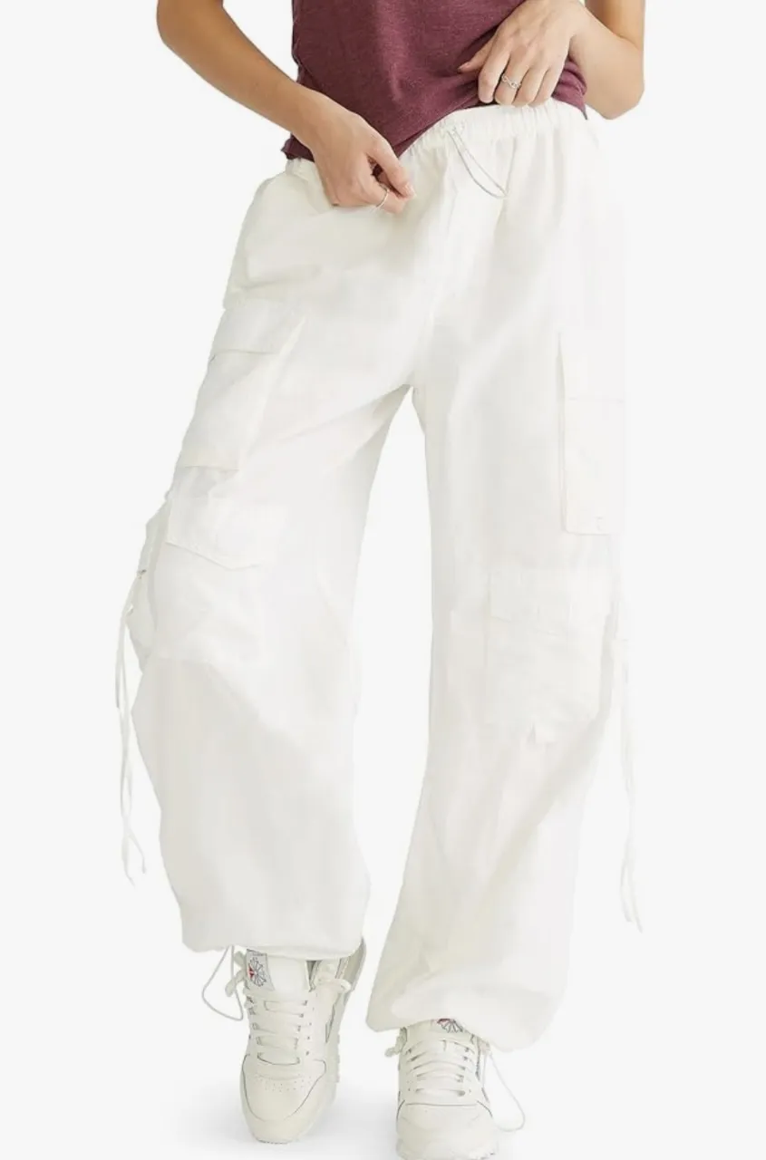Pantalón cargo Aeropostale, color blanco. Diseño tipo parachute con cordones ajustables en la cintura y en los tobillos. Posee múltiples bolsillos cargo. Liviano y fresco. Ideal verano.